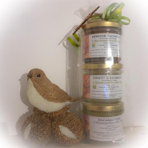 Coffret composé 1 verrine d'Escargots 1 Douzaine, 1 confit Escargots 1 Douzaine et 1 Escargotine 80 g.